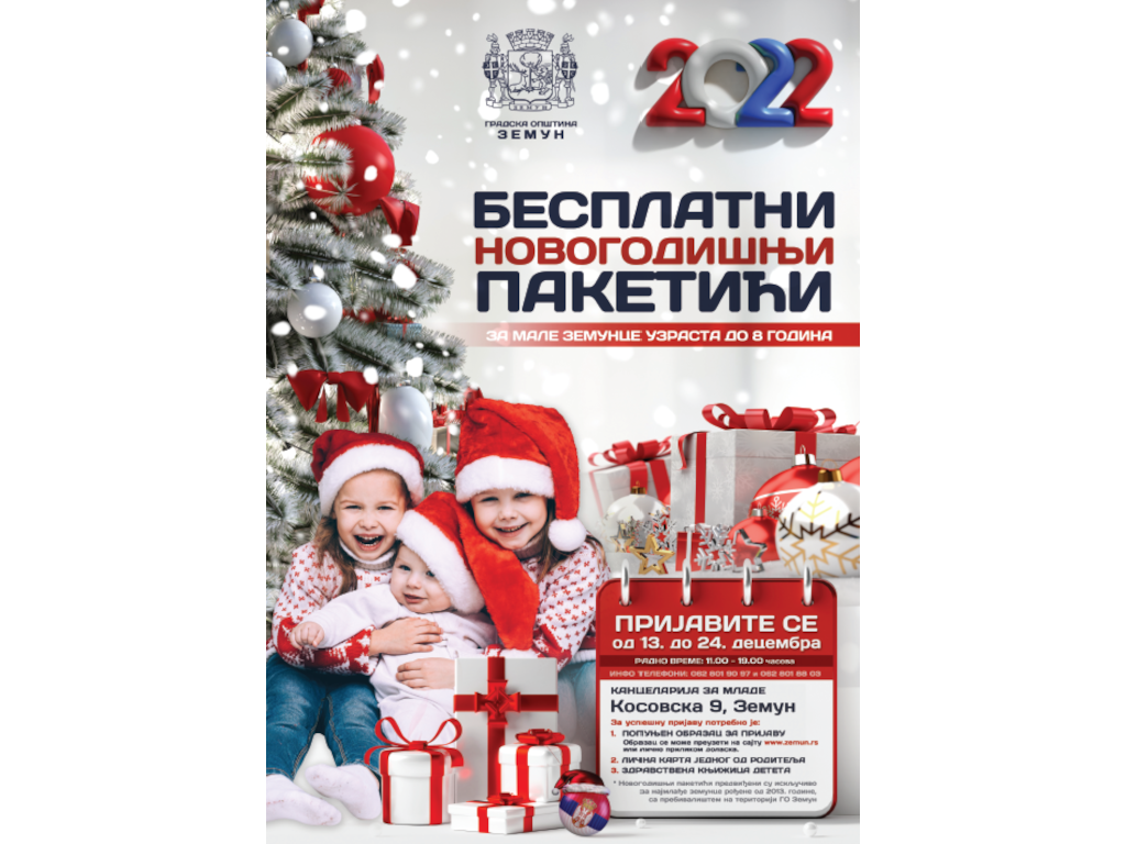 Prijavljivanje za novogodišnje paketiće je od 13. do 24. decembra 2021. godine u Kosovskoj broj 9, svakog dana u periodu od 11 do 19 časova, saoptio je Odsek za poslove protokola i informisanja Gradske opštine Zemun.