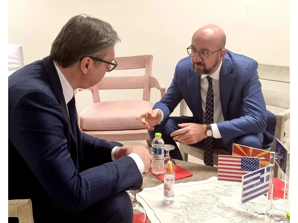 Vučić se sa Mišelom sastao uoči ceremonije obeležavanja početka radova na izgradnji terminala za tečni prirodni gasu u Aleksandrupoliju, objavljeno je na Instagram nalogu budućnostsrbijeav, uz fotografije.